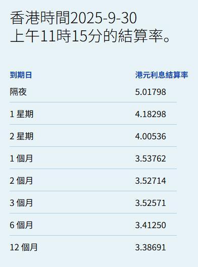 智通财经APP获悉,9月30日,港元拆息普遍向下配资开户官网,而与楼按相关的一个月拆息报3.53762%,跌6.042基点,并连跌四日;反映银行资金成本的三个月拆息报3.52571%,跌0.143基点。值得关注的是,隔夜息报5.01798%,升130.262基点。