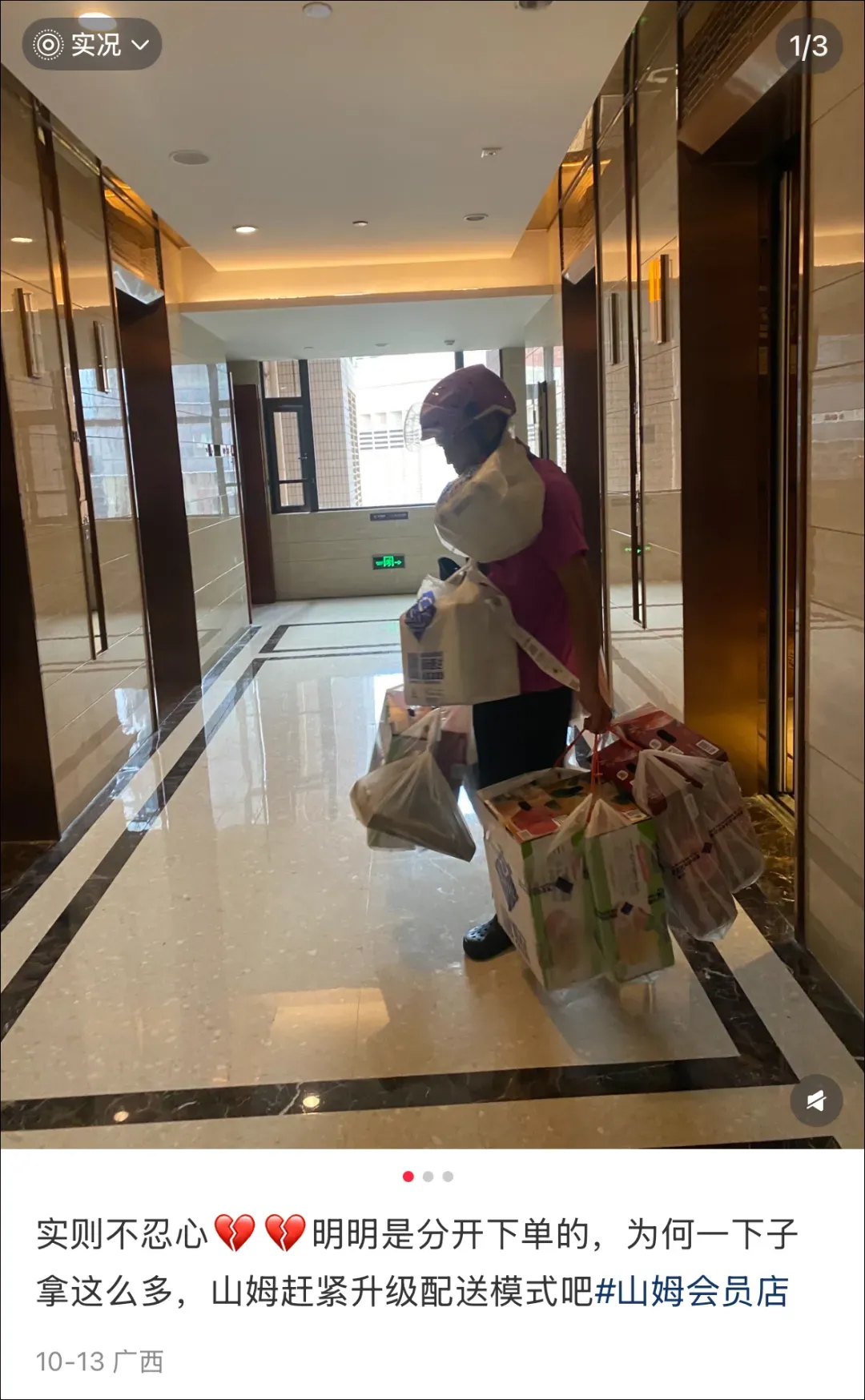 此前,多位网友发布帖子质疑山姆会员商店配送方式存在不合理。