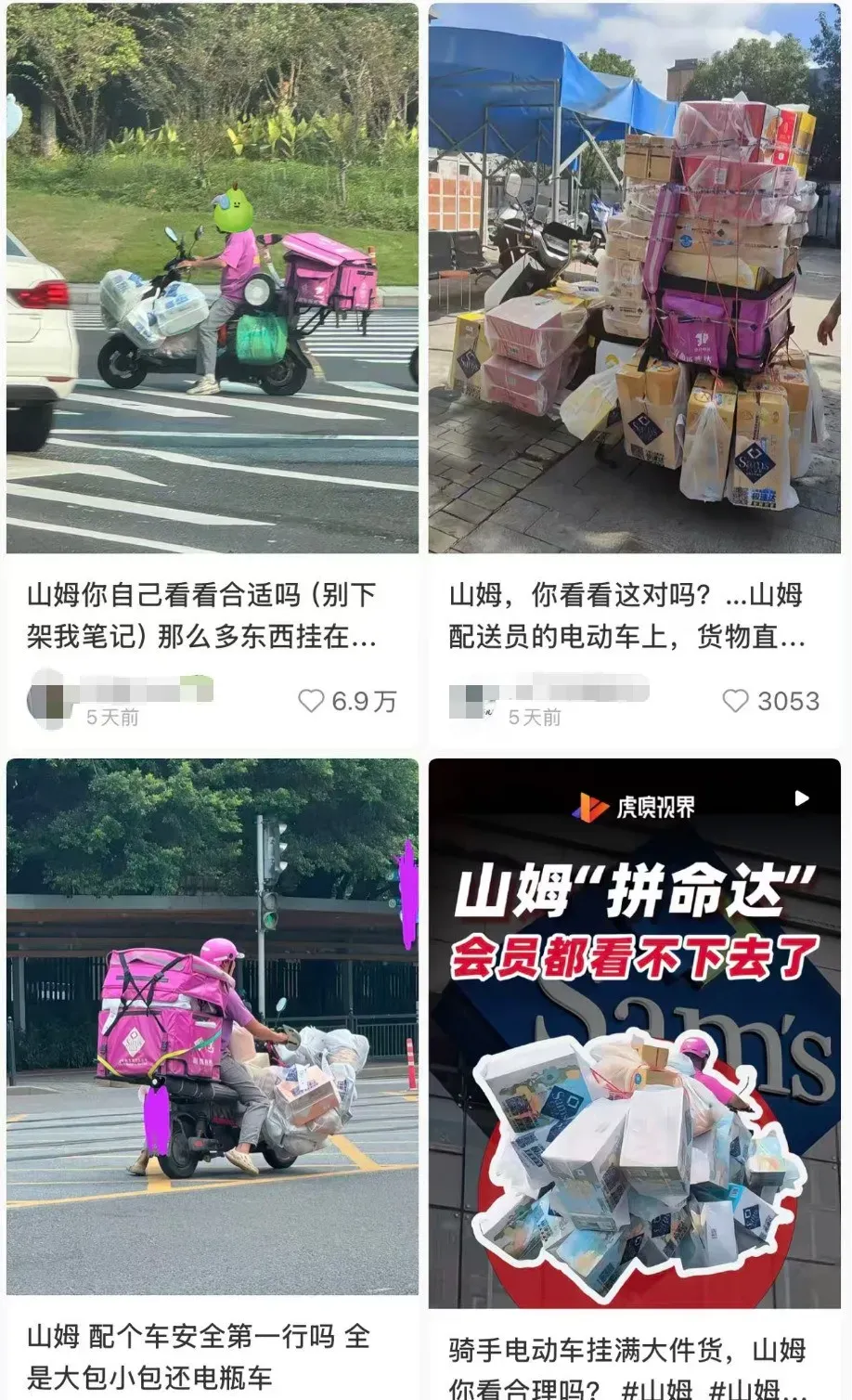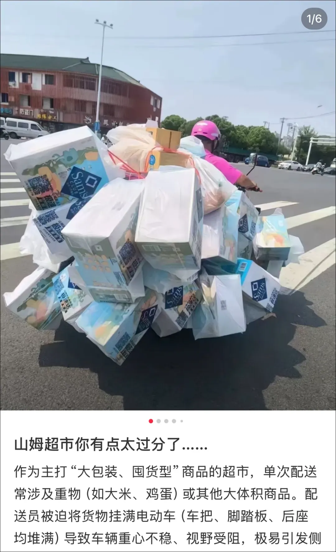 由于山姆主打量大囤货的商品定位,用户下单货物通常也较多,不少网友质疑以电动车作为大件货物的配送工具是否合适、是否存在道路交通安全隐患?